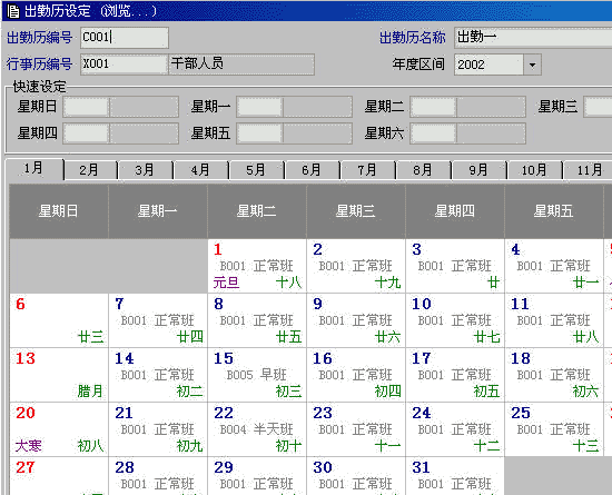 | ¡E ¦b¨t²Î¤¤¥i¥H³]©w¦UºØ¯Z§O¤ñ¦p¡G¤é¯Z¡A¤¤¯Z¡A¤j©]¯Z¡A¥b¤Ñ¯Zµ¥µ¥¡A°£¦¹¥~ÁÙ¥i¥H¦b¥X¶Ô¾ä¤¤³]©w¤@¦~ªº¤W¯Z±¡ªp |